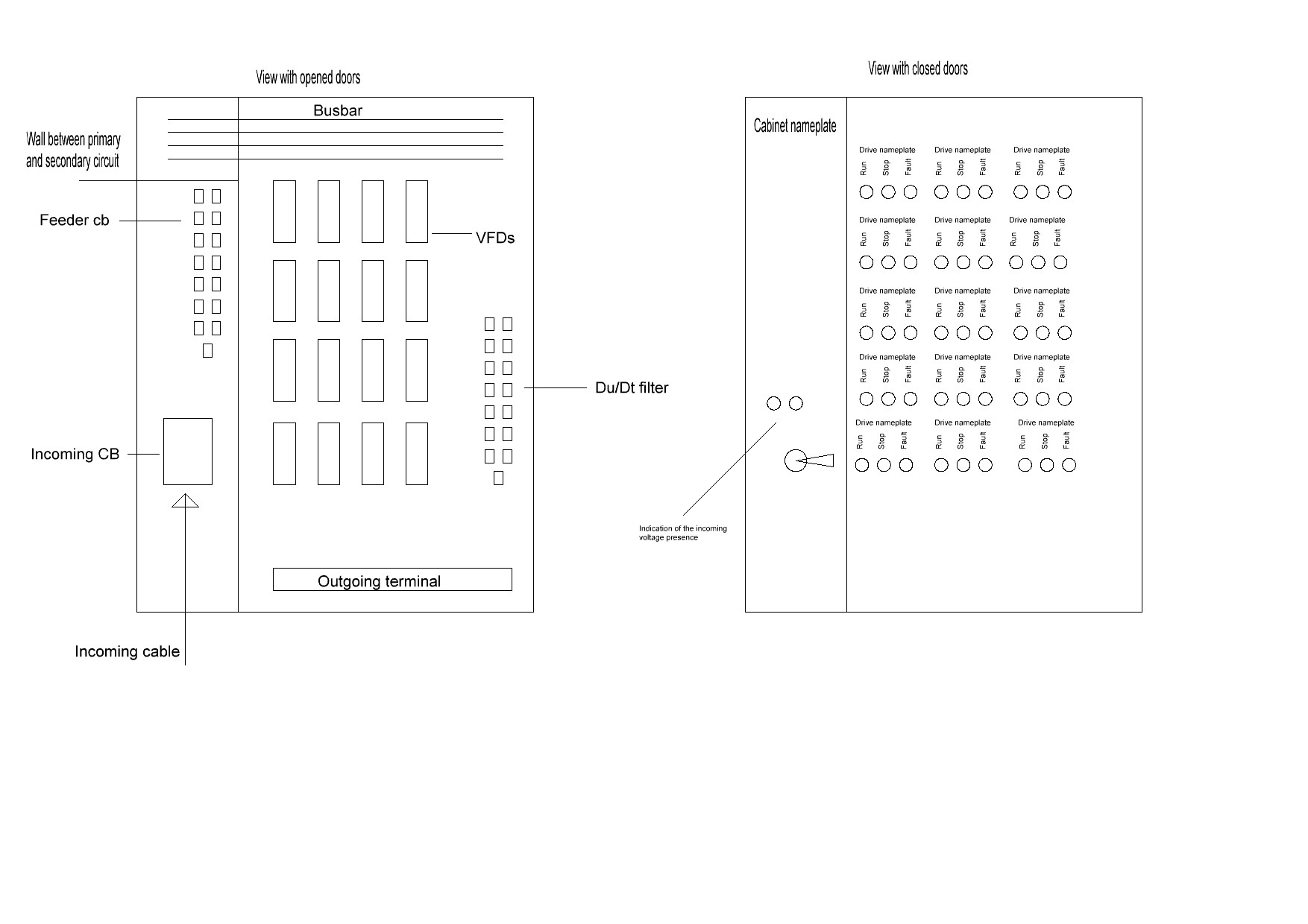 მართვის პანელი სიხშირული გარდამქმნელებით АВВ ACS880; Ethernet IP-ის მართვა FENA-21 მოდულების საშუალებით; სიხშირული გარდამქმნელის მონაცემები"reagents sld" ფაილის მიხედვით; პანელის ზოგადი დიზაინი "Cabinet design" ფაილის მიხედვით. - 1 კომპლექტი
