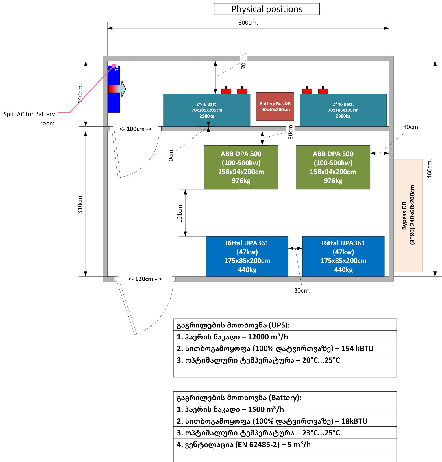 - სათავსო შედგება 2 ნაწილისგან, დიდ ნაწილში განთავსდდება 1000 კვ ups ი. პატარაში აკუმლატორები. იხ.ნახაზი